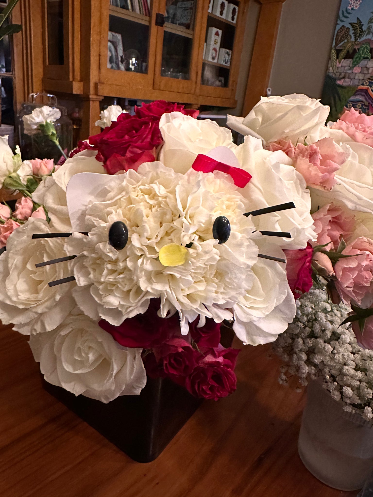 The HK inspired bouquet is a limited edition Valentine's Day arrangement that combines the iconic cuteness of HK with the timeless beauty of fresh carnations, roses and spray roses. This unique bouquet is perfect for treating yourself or surprising a loved one. Don't wait, limited quantities so pre order yours now!